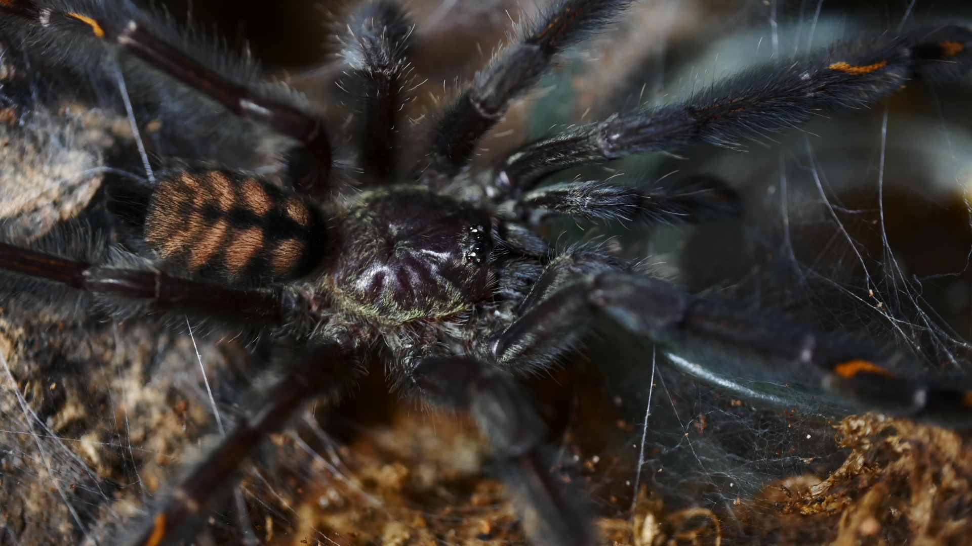 Aussehen: Die Tiere haben schwarze Beine mit orangen Flecken und ein schwarzes Carapax(Vorderkörper), sowie ein rot schwarzes Abdomen(Hinterleib) mit "Tigermuster".