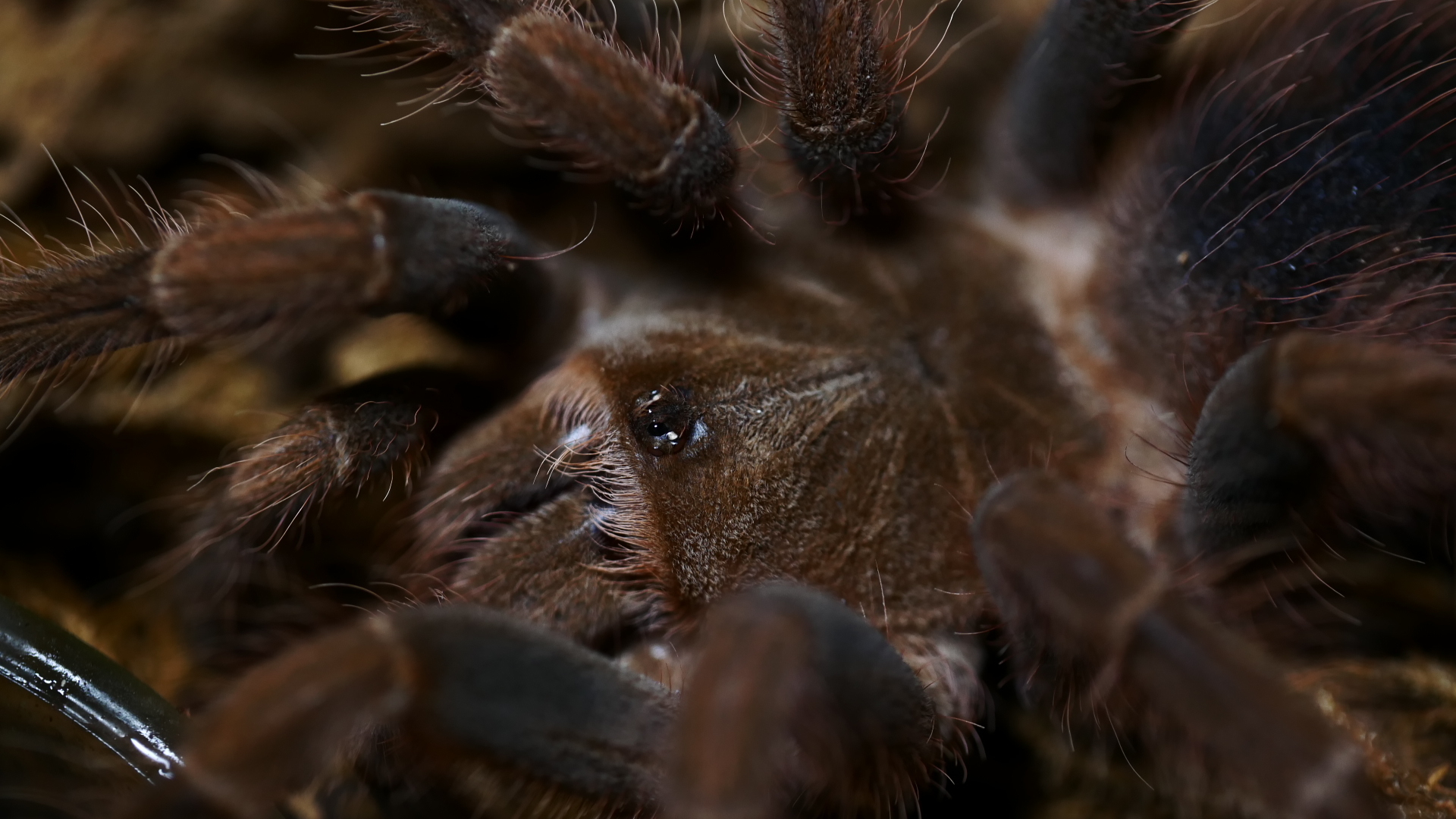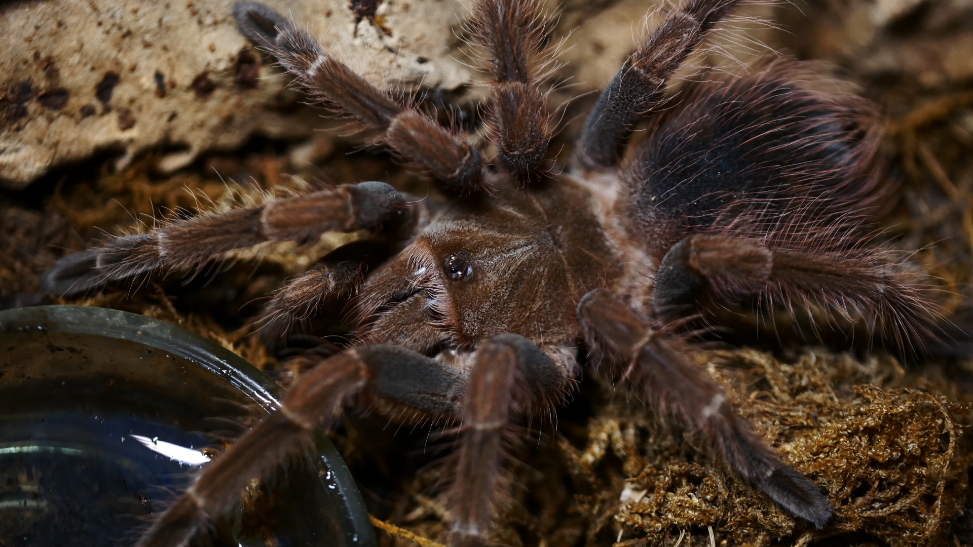 Aussehen: Die Tiere haben braune Beine mit leichten Streifenmuster und ein braunes Carapax(Vorderkörper), sowie ein ebenfalls braunes Abdomen(Hinterleib) mit rötlichen Brennhaaren.
