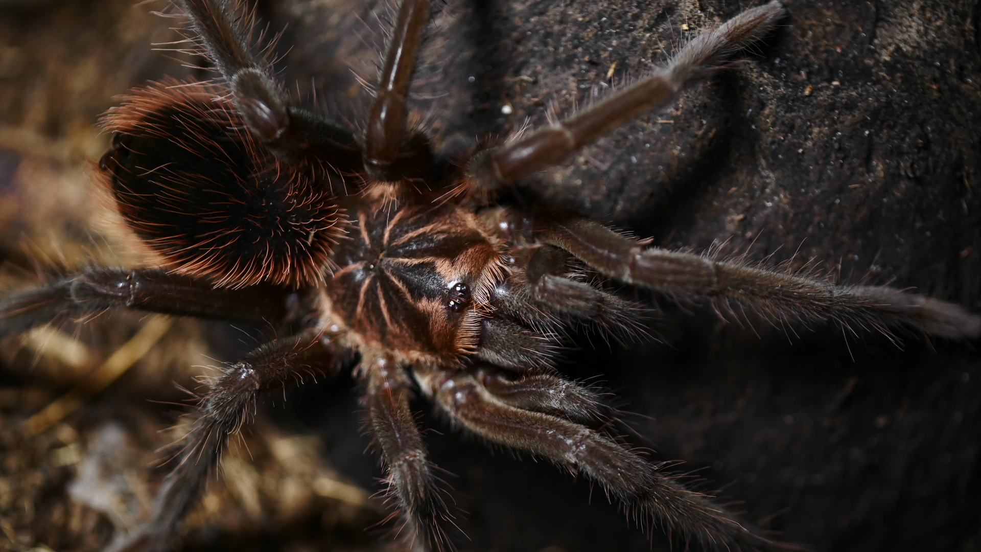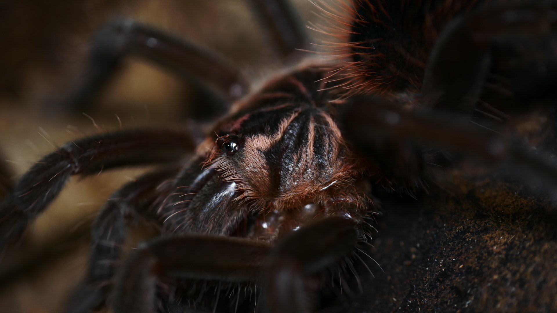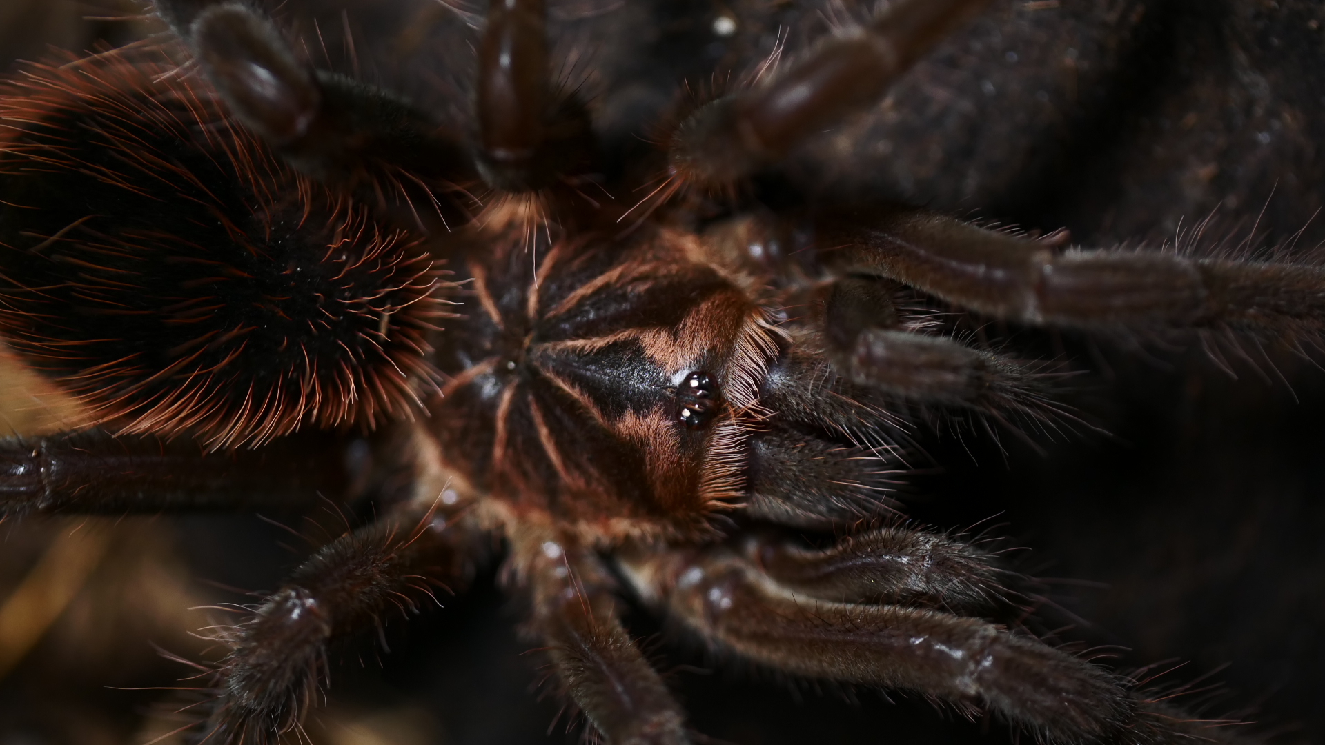 Aussehen: Die Tiere haben schwarze Beine und ein rötliches Carapax(Vorderkörper), sowie ein dunkles Abdomen(Hinterleib) mit hellroten Haaren.