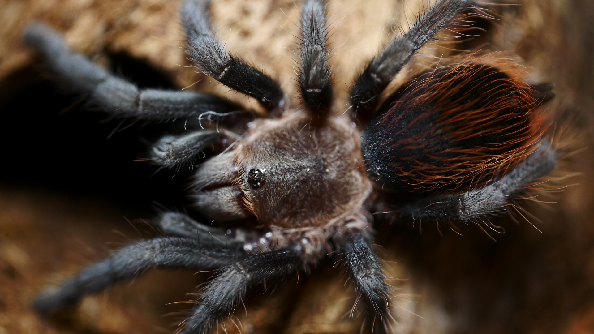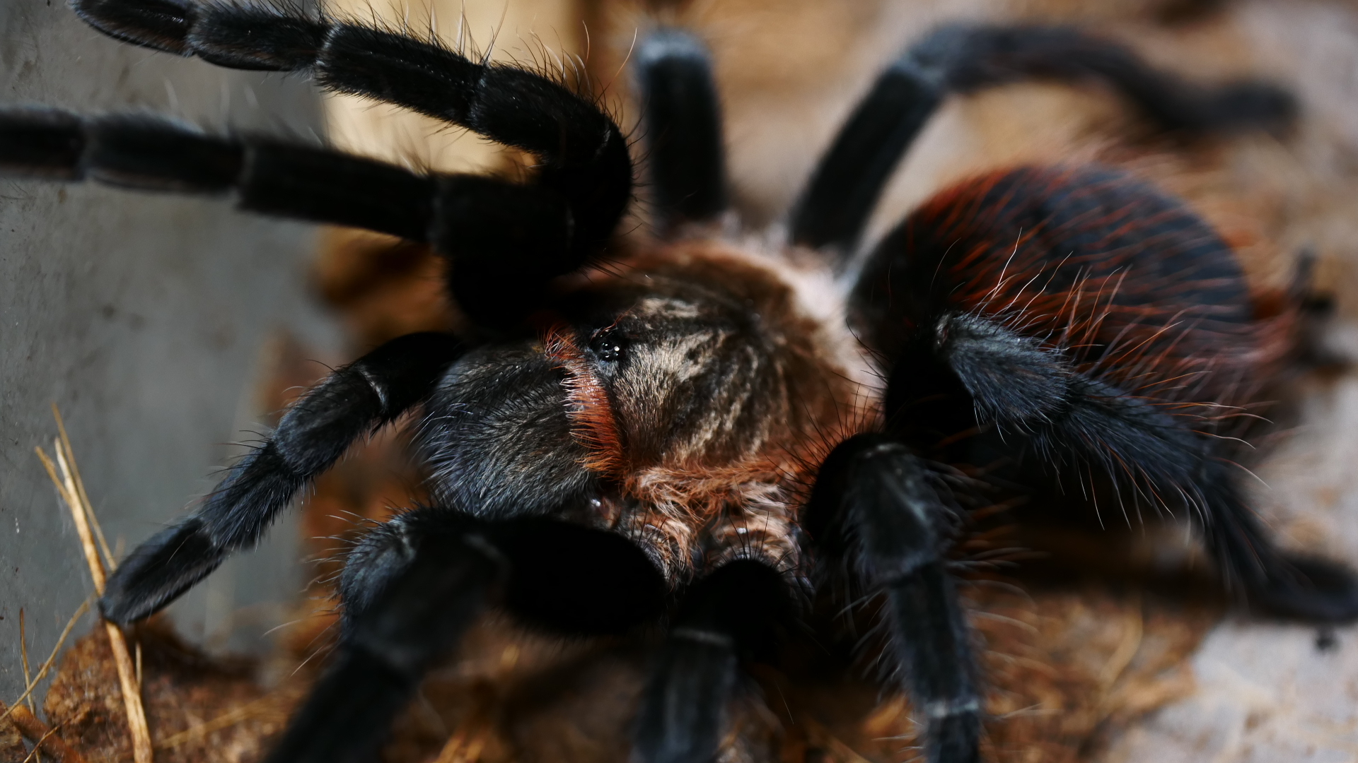 Aussehen: Die Tiere haben schwarze Beine und ein schwarzes Carapax(Vorderkörper) mit heller Umrandung, sowie ein schwarzes Abdomen(Hinterleib) mit roten Brennhaaren.